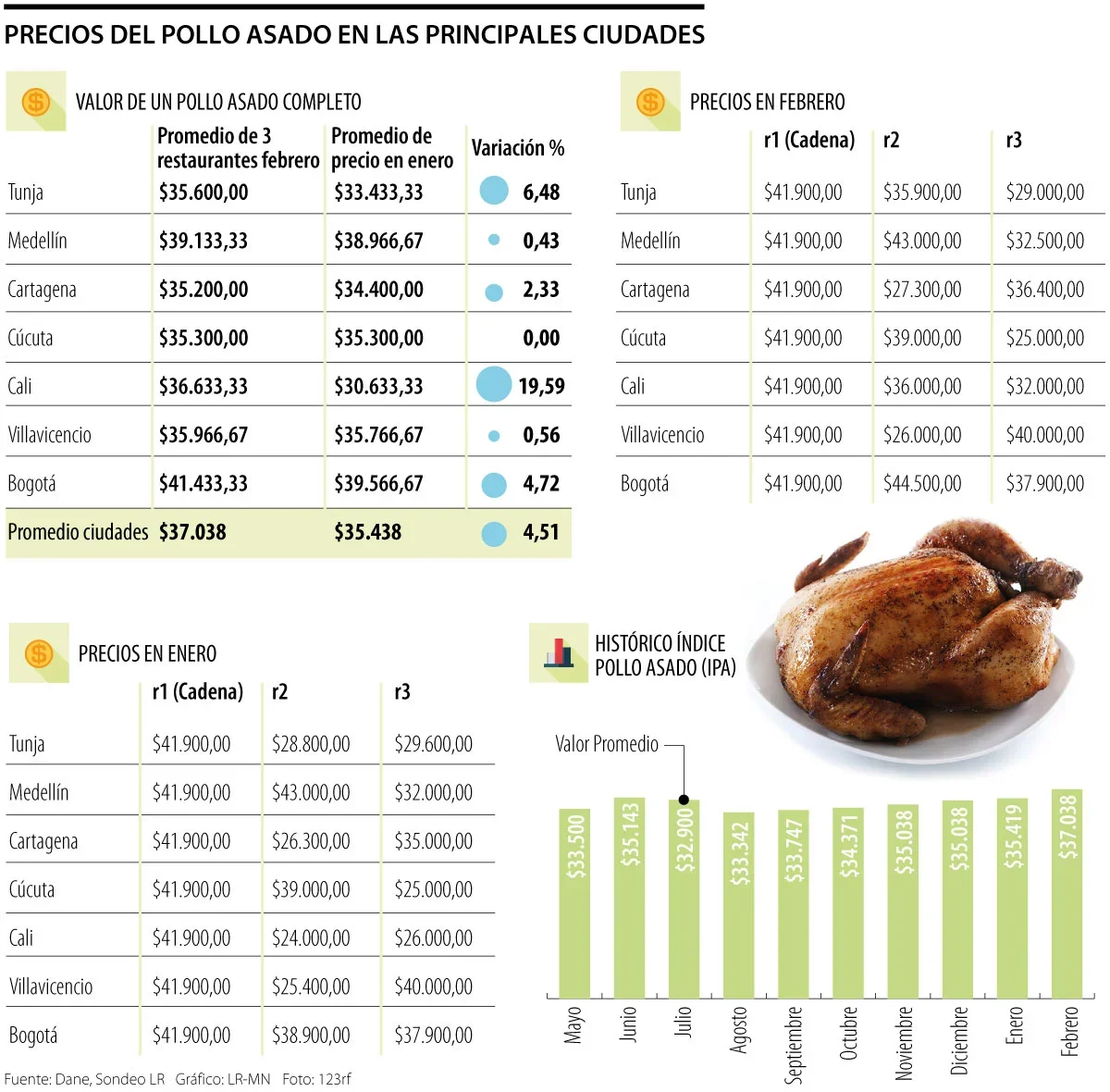 Este indicador, que realiza un sondeo con los asaderos de pollo de las principales ciudades de Colombia entre las que se encuentran Medellín, Cartagena, Cúcuta, Cali, Villavicencio, Bogotá y Tunja, también mostró que el precio del pollo asado subió en casi todas las ciudades mencionadas, siendo Cali la capital que tuvo la mayor alza, con 19,59% y un costo promedio de $36.633, seguida de Tunja, donde subió 6,48%, con un precio promedio de $35.600.