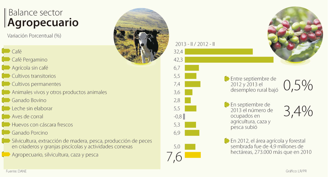 El ranking de los sectores con mayor producción lo lideró café con un aumento de 32,4% en comparación con el segundo trimestre de 2012, seguido del sector agrícola con 6,7%, silvicultura, extracción de madera, pesca, producción de peces en criaderos y granjas piscícolas 5,0% y animales vivos 3,6% Por productos sobresale el crecimiento del cultivo de la papa con 13,4% y el de hortalizas con el 11,1%. El sector frutícola creció 9,3% y el del plátano 8,0%.
