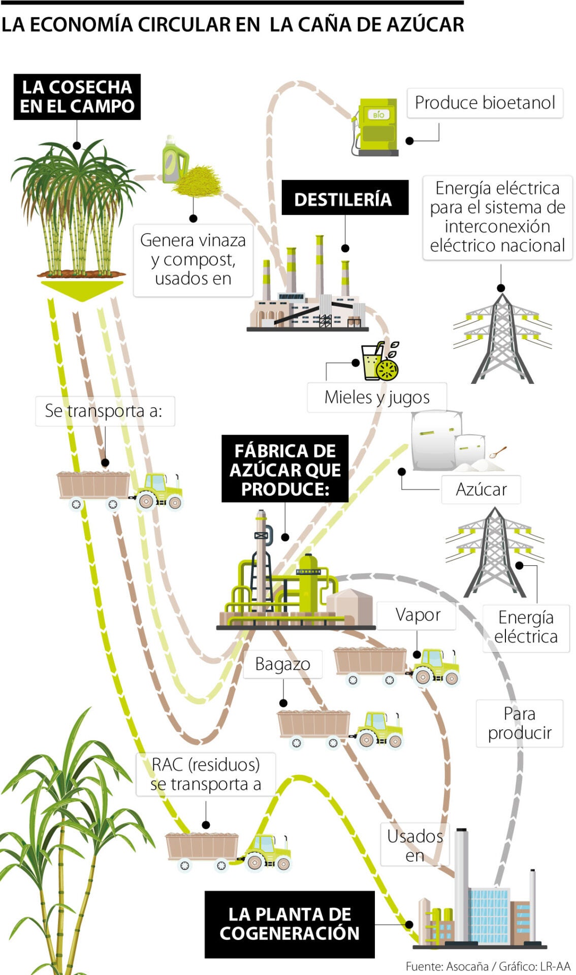 Y dentro de este exitoso modelo de economía circular está un actor fundamental, los ingenios. Uno de ellos es Ingenio Risaralda, ubicado en La Virginia (en ese departamento), que se ha consolidado como uno de los complejos agroindustriales más completos, eficientes y sostenibles del país, que cuenta con 16.462 hectáreas y que el año pasado tuvo ventas totales por un valor de $595.134 millones. Todo allí, como en los demás, es milimétricamente calculado para su optimización. Por ejemplo, el bagazo de caña, subproducto de la molienda, es utilizado como combustible en las calderas, generando energía eléctrica para toda la planta.