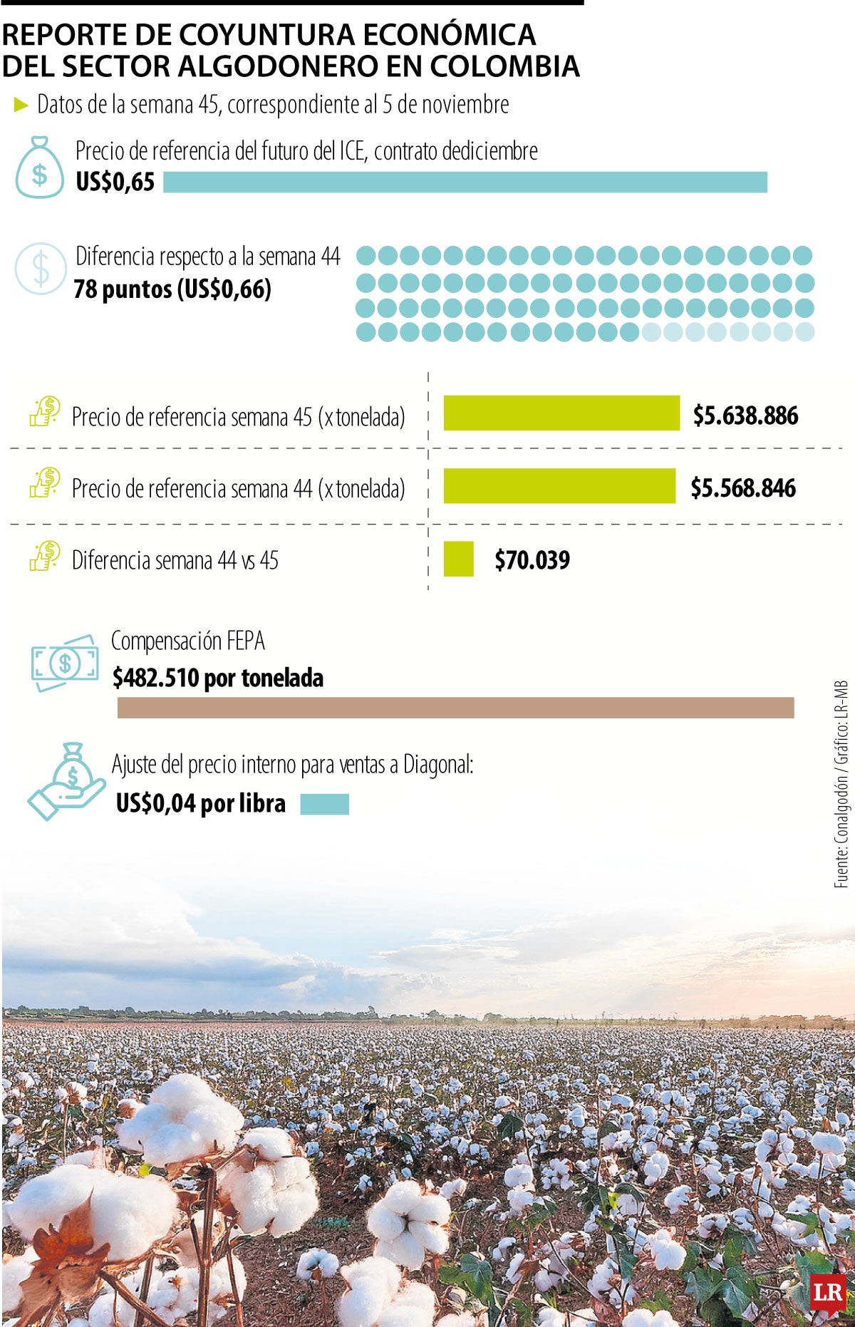 El algodón es uno de los pocos cultivos en Colombia que tiene 100 % de su comercialización asegurada, dado que desde Diagonal se compra la totalidad de la producción nacional. Además, el sector viene gestionando con el Gobierno la actualización de los protocolos fitosanitarios de exportación hacia mercados como México, replicando lo hecho con Perú y Chile, donde hay mayores avances, por lo cual las expectativas para el año entrante son positivas, pero con la incertidumbre marcada en cuanto a lo que suceda con los aranceles.