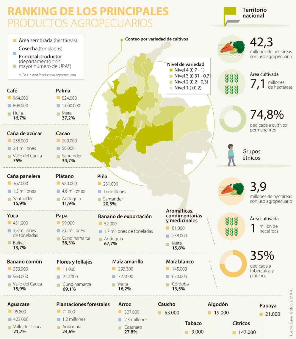 Perfetti también resaltó que a diferencia de ejercicios anteriores este Censo abordara el renglón de los grupos étnicos, los cuales, se sabe, tienen un millón de hectáreas cultivadas (más de la mitad de ellas en territorios indígenas), 35% en tubérculos (principalmente yuca) y plátanos. Y si bien una parte importante de esta cosecha (3,4 millones de toneladas) se destina al autoconsumo, también ha crecido su participación en los mercados locales.
