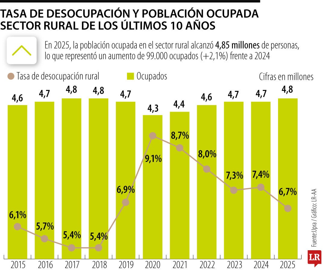 Adicionalmente, señaló que la reducción se dio sobre todo en categorías de trabajadores por cuenta propia y de agricultura familiar, segmentos que suelen tener un peso importante dentro de la estructura laboral del campo colombiano.
