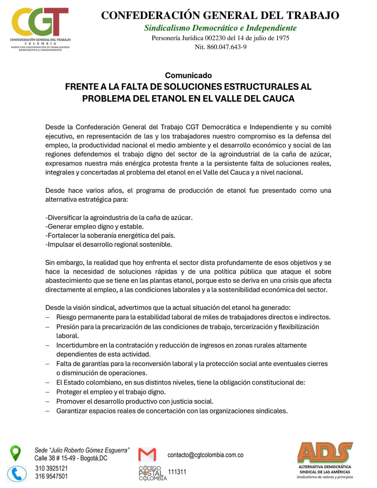 Las principales centrales obreras del país advirtieron sobre una crisis estructural en el sector del etanol en Colombia, especialmente en el Valle del Cauca, y pidieron al Gobierno nacional la adopción de medidas urgentes para proteger el empleo y garantizar la sostenibilidad productiva de la agroindustria de la caña de azúcar.