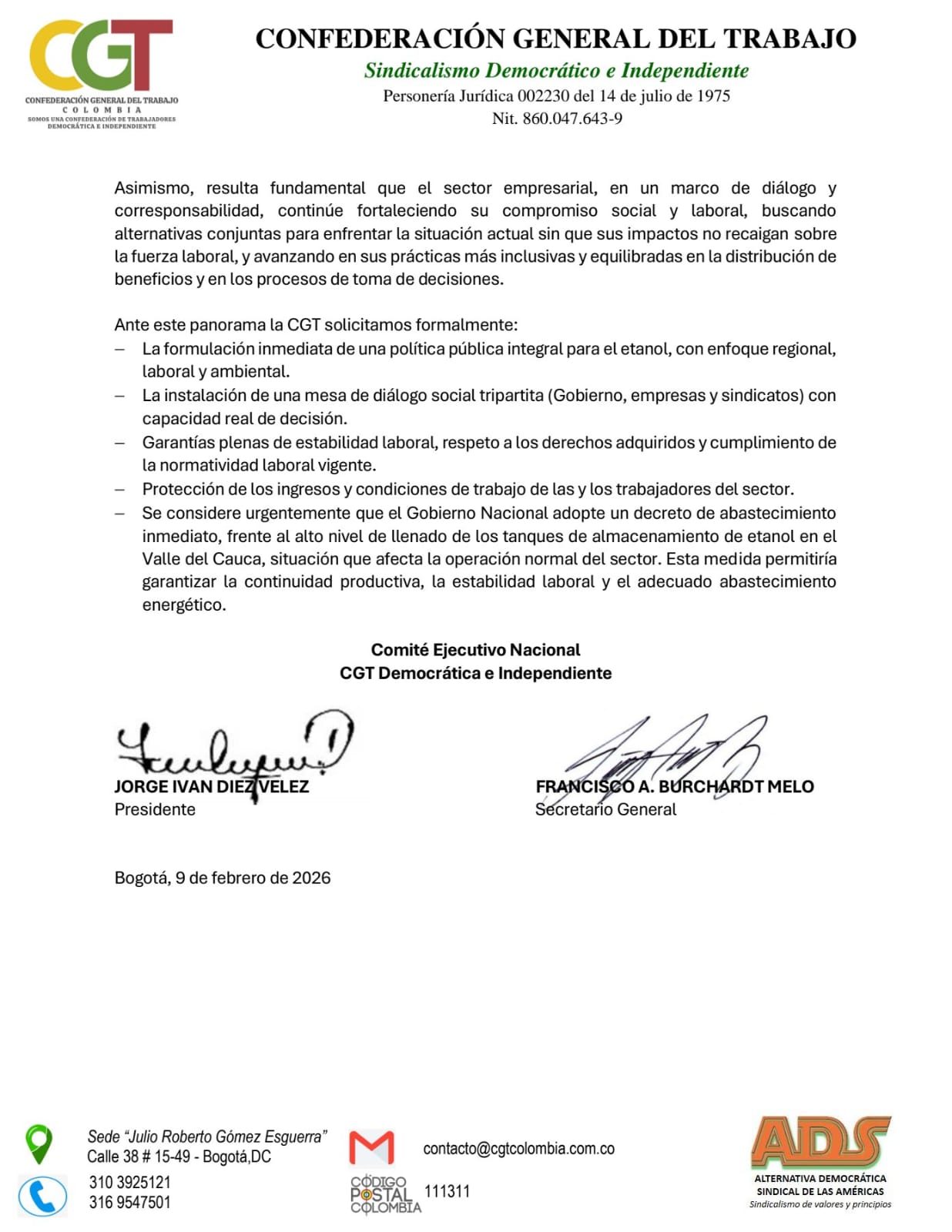 Entre las principales solicitudes al Gobierno se encuentra la formulación inmediata de una política pública integral para el etanol con enfoque regional, laboral y ambiental, así como la instalación de una mesa tripartita de diálogo entre Estado, empresas y sindicatos con capacidad real de decisión.