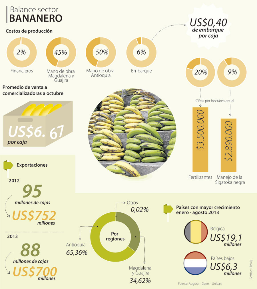 Por lo tanto, la caja que estaba en promedio en US$6,67 llegó a los US$3. Además, la dificultad para diferenciar al banano colombiano frente a los demás productos de otros países, disminuyó su precio en el exterior.