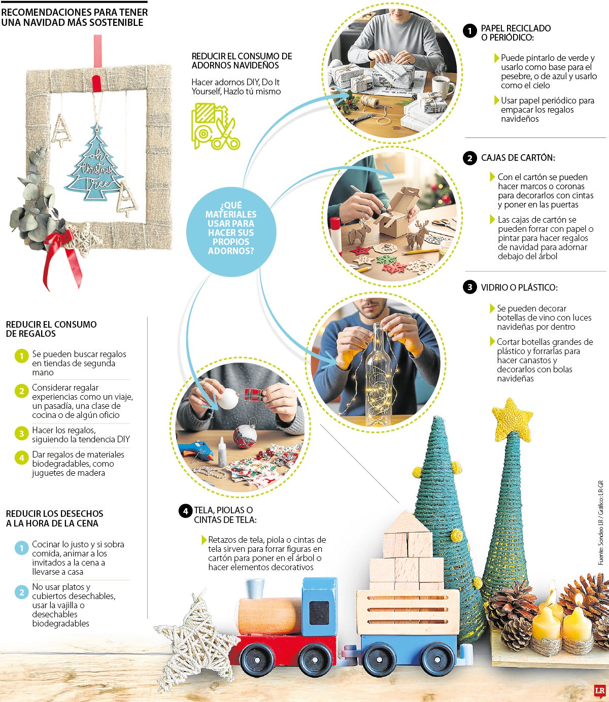 Las posibilidades son muchas, pues todo dependerá de lo que se tenga en casa, teniendo en cuenta que el darle una segunda vida a estos materiales será lo fundamental para hacer una Navidad más sostenible y amigable con el medio ambiente, pues esto disminuye la compra de nuevos adornos, permite reacondicionar los antiguos o realizar nuevas decoraciones.