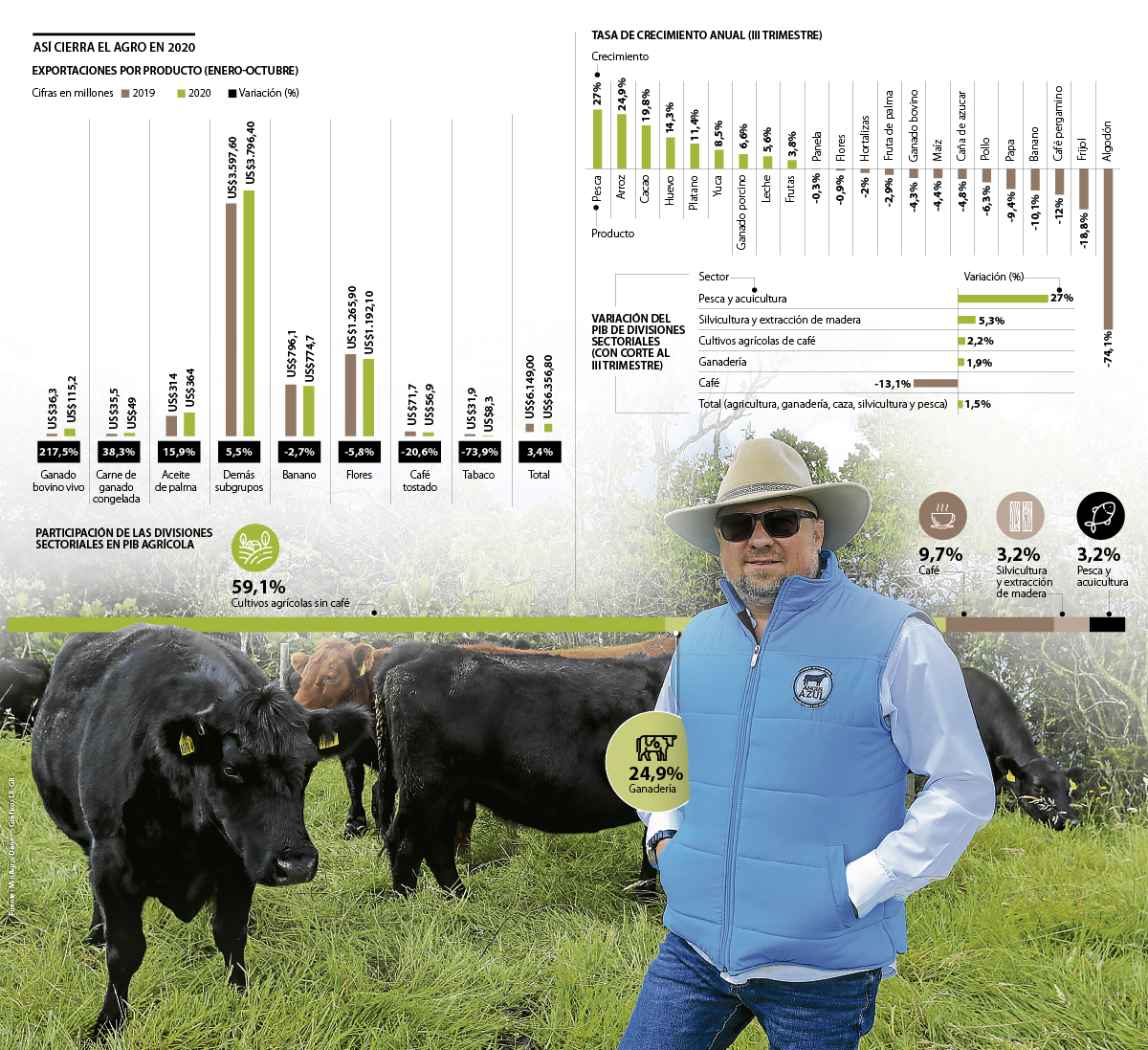 El sector más destacado fue el de la ganadería, pues no solo tuvo una variación de 1,9% en el PIB agrícola, sino que su participación en el mismo llegó a 24,9% según el Ministerio de Agricultura y Desarrollo Rural. Por su parte, el crecimiento de las exportaciones ascendió hasta 217% en el caso de ganado bovino vivo, de acuerdo con datos del Departamento Administrativo Nacional de Estadística (Dane).