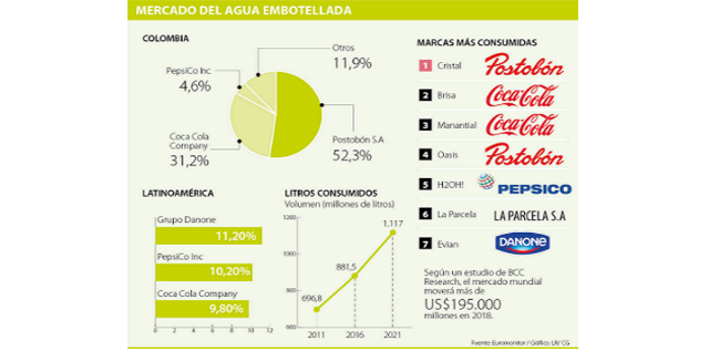 En el caso de Colombia, los habitantes consideran que el agua de grifo no es potable, entonces por cuestiones de salubridad prefieren comprar agua en botella. “Cada vez hay más empresas que explotan este recurso para venderlo, pero siguen siendo las grandes compañías las que lideran el mercado. No obstante, el negocio tiene bastante demanda, por lo que empresas locales también se han visto beneficiadas por el alto consumo de este producto”, indicó Ávila.