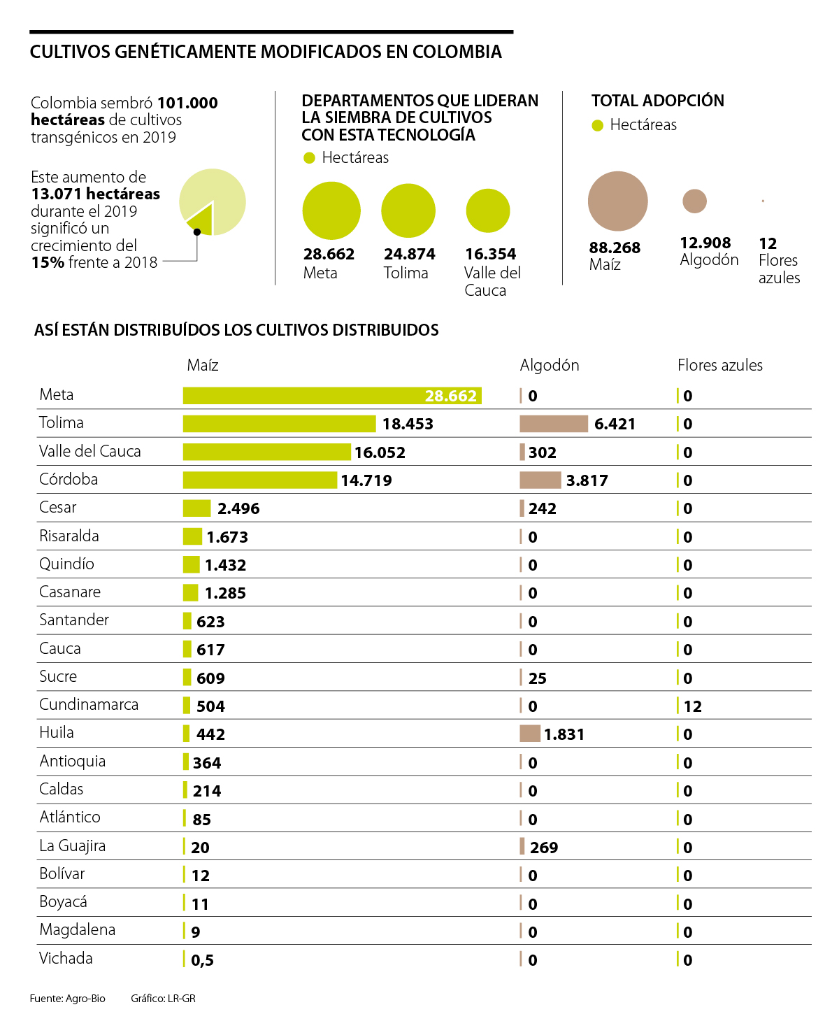 De acuerdo con información de Agro-bio, los tres departamentos que lideran la siembra de cultivos con esta tecnología son Meta con 28.662 hectáreas, Tolima con 24.874 y el Valle del Cauca con 16.354 hectáreas, siendo este último el que más creció de los tres con una tasa de 43% anual.