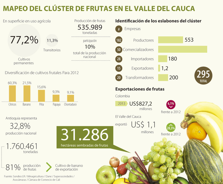 En 2013 las exportaciones colombianas de frutas sumaron US$827 millones, representando una disminución de 6,1% frente a 2012. Solo el Valle del Cauca dirigió hacia los mercados externos US$1,1 millones, registrando un crecimiento de 28,3% frente a 2012, cifra que podría seguir ascendiendo más aceleradamente, según expertos, si se descentraliza un poco la participación del banano. Este producto representó 91,4% de las exportaciones de frutas del país en 2013.