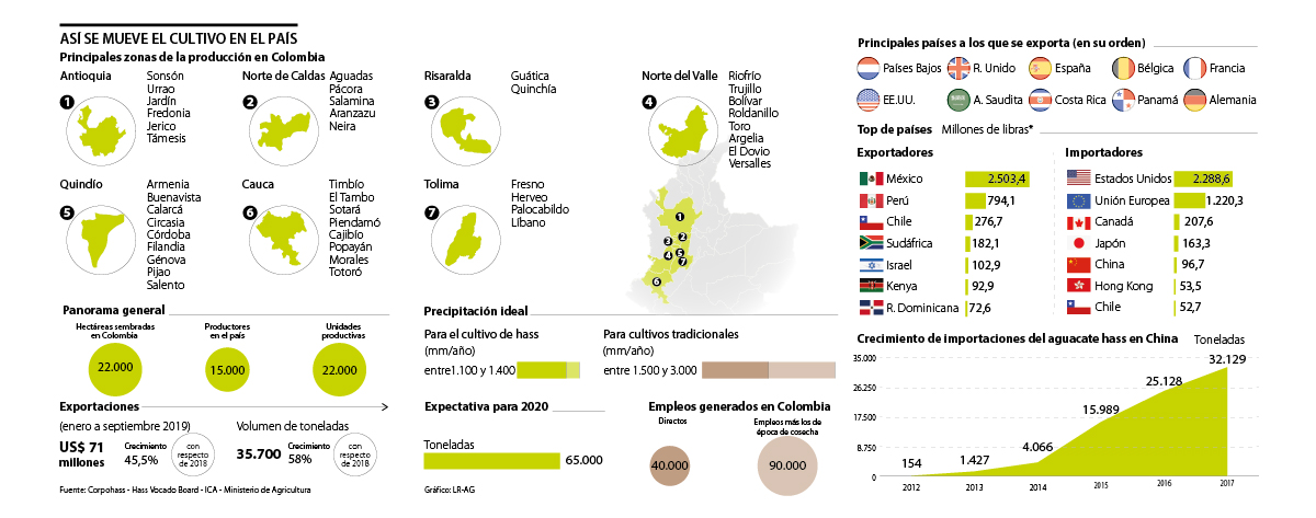 Si bien Colombia ha sido un productor histórico de aguacate, las exportaciones de la variedad hass crecieron de forma acelerada en el último lustro. Hoy, según Corpohass, el país ocupa el quinto renglón en los envíos de productos agrícolas del país al exterior solo superados por el café, banano, flores y la palma de aceite.