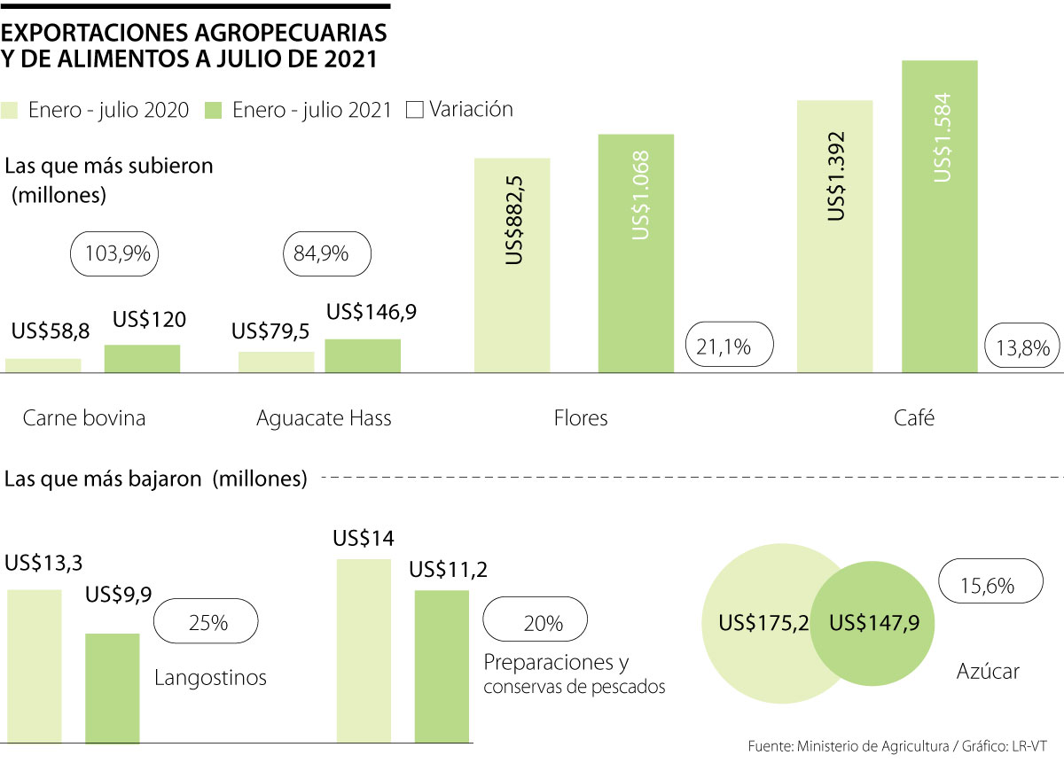 De acuerdo con datos del Ministerio de Agricultura, a julio las exportaciones de la carne bovina crecieron 103,9% a US$120 millones de dólares, mientras que las ventas al exterior del aguacate hass totalizaron US$146,9 millones, con un incremento de 84,9%.