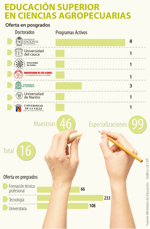 Las estadísticas del Ministerio de Educación señalan que en total las universidades del país ofrecen 161 programas en posgrados en áreas de ciencias agropecuarias, medicina veterinaria, zootecnia y agroecología, entre otros. De este total 16 son doctorados, 46 maestrías y 99 especializaciones. En pregrados la oferta supera los 400 programas. En formación técnica profesional hay 66 activos, tecnologías 233 y en profesional 108.