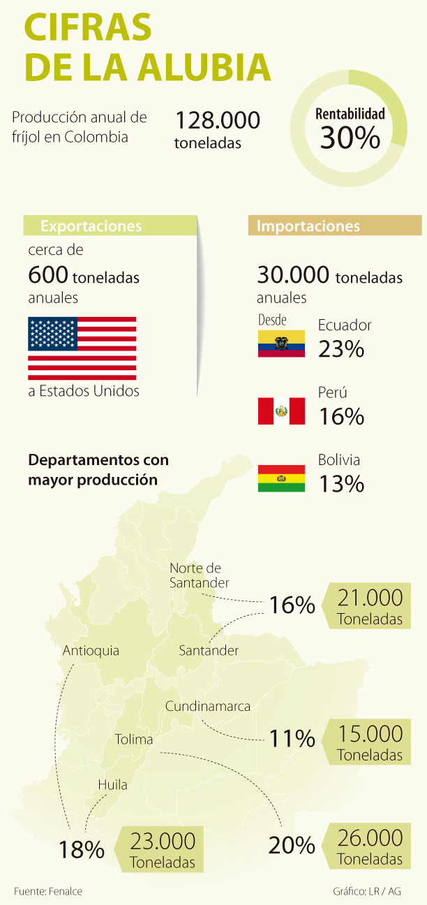 Según Henry Vanegas, gerente general de la Federación Nacional de Cultivadores de Cereales y Leguminosas (Fenalce), en este último año, la producción fue de 128.000 toneladas. “El cultivo de fríjol en Colombia tiene rentabilidad del 30%, pero los costos varían con las zonas productoras”.