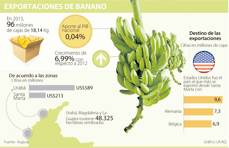 El año anterior las ventas externas fueron de 89,8 millones de cajas por valor de US$736,4 millones. Bélgica, Estados Unidos y Alemania fueron los países a los que se les envió esta fruta colombiana con participación de 35,25%, 25,50% y 12,61 % respectivamente.