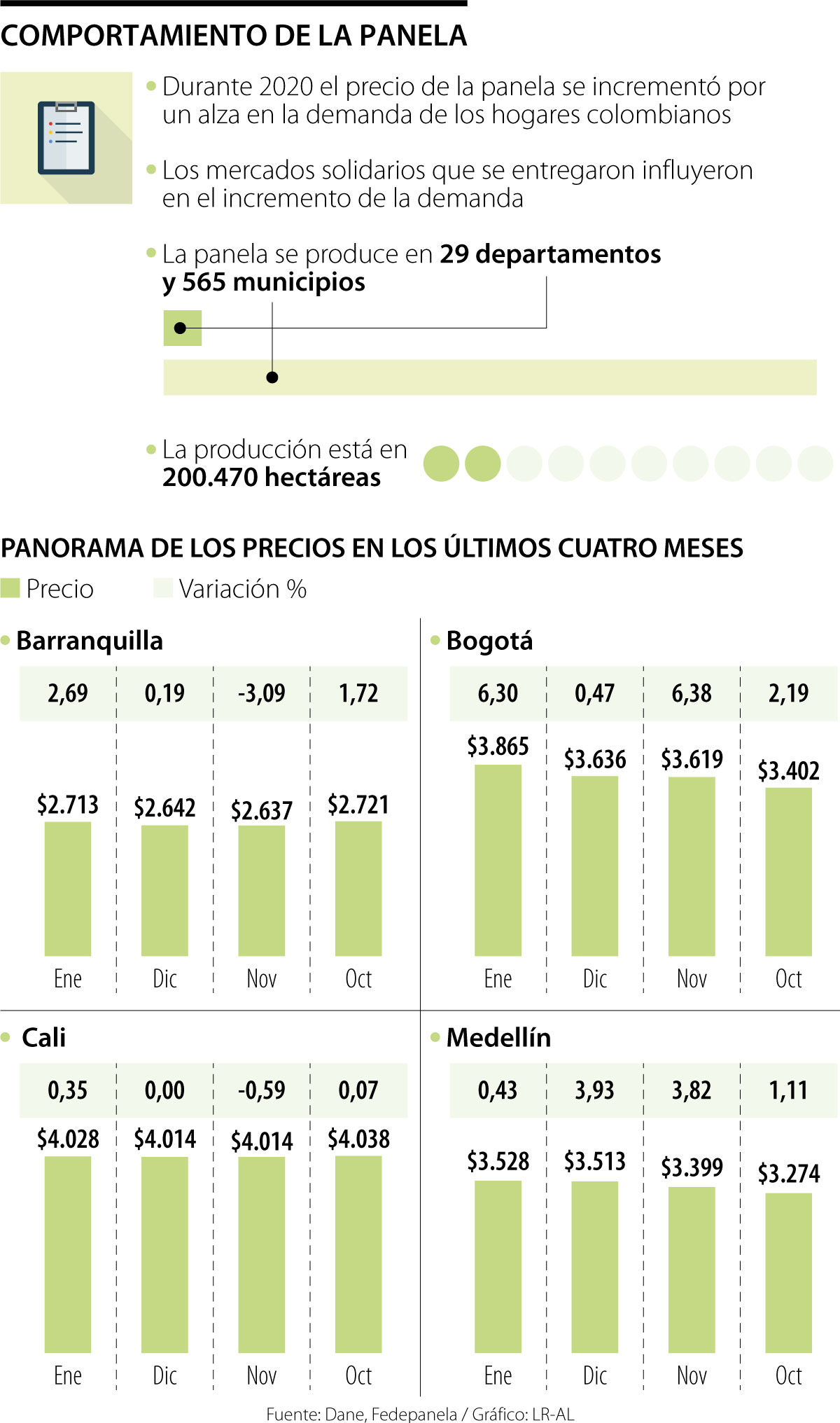En concreto, los precios de la panela en enero y según el Sipsa (Sistema integrado de precios) del Dane estaban, en promedio, en $3.521 (teniendo en cuenta los precios de las siete ciudades principales), mientras que en noviembre de 2019 estaban en $2.427, un alza de más de 45% en dos meses.