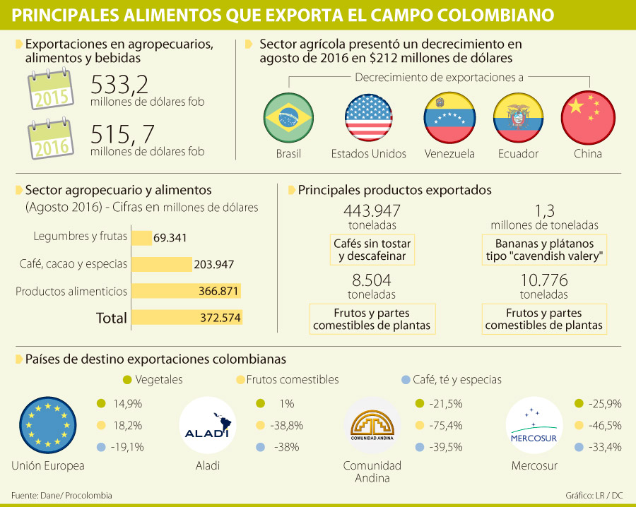 En informes presentados por el Dane y la Dian, los productos agropecuarios que cayeron en septiembre fueron el café, té, cacao y especias con US$ 284 millones en 2015 y US$ 222 millones. Mientras que los que aumentaron fueron las legumbres y frutas subiendo a US$79 millones en 2016 y los productos animales y vegetales en bruto a US$104 millones de dólares.