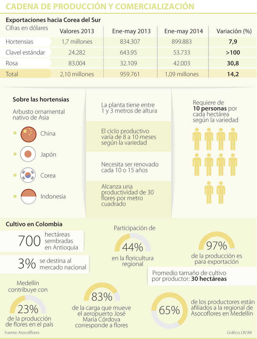 El año pasado, el país le vendió a Corea del Sur US$1,7 millones en estas flores. Entre enero y mayo de este año las exportaciones alcanzaron el US$1 millón con un crecimiento de 7,9% frente al mismo periodo de 2013.