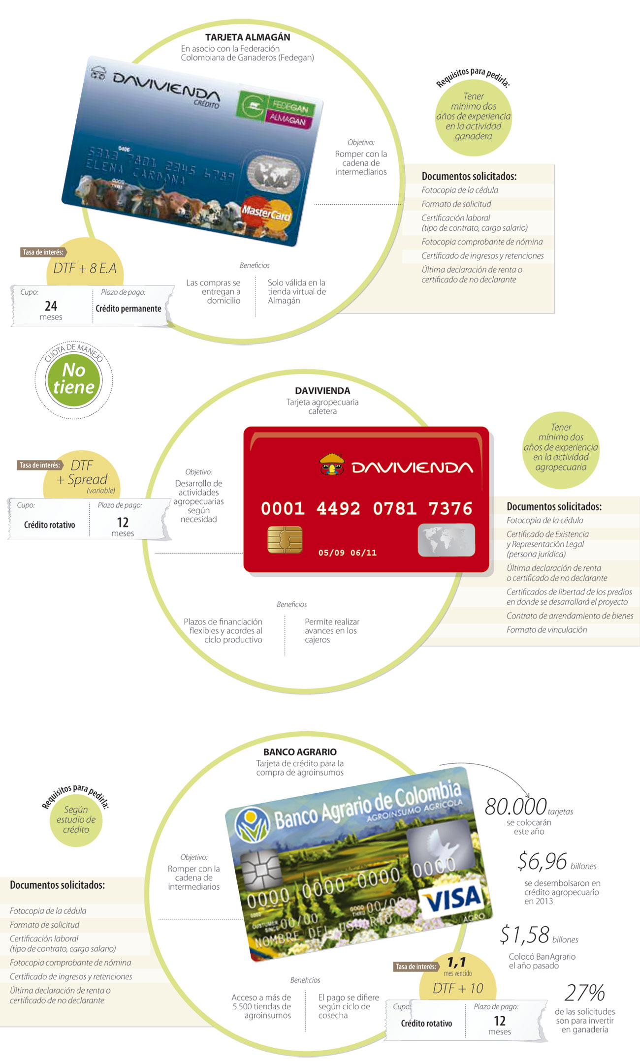 Sin embargo, este no es el único medio de pago exclusivo para el sector, Davivienda también ofrece dos productos similares: la tarjeta agropecuaria cafetera y la tarjeta Almagán.