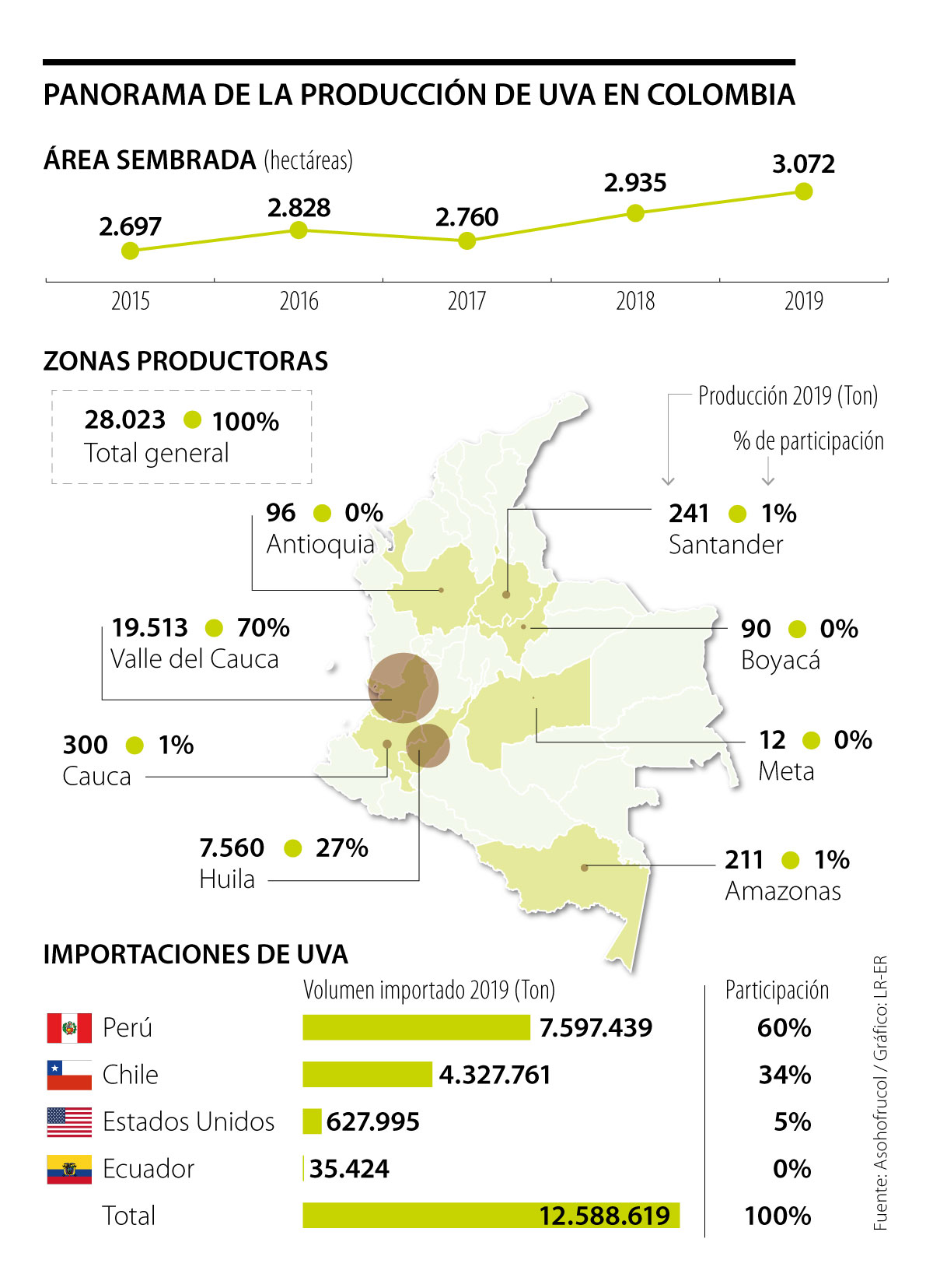 Sobre las zonas, Asohofrucol destacó que actualmente, las principales regiones productoras de uva en el país son el Valle del Cauca, departamento que produjo al cierre de 2019 un total de 19.513 toneladas de la fruta con una participación general de 70%, seguido por Huila con 7.560 toneladas producidas (27%) y Cauca con 300 toneladas (1% de participación).