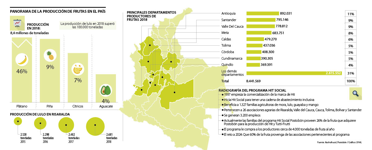Colombia produjo en promedio 8,4 millones de toneladas de frutas el año pasado, la mayor producción se dio en plátano que abarca 46% del total producido, seguido por piña (9%), cítricos (7%) y aguacate (4%). Para el caso específico del lulo, la producción en 2018 superó las 100.000 toneladas, según cifras de Asohofrucol.