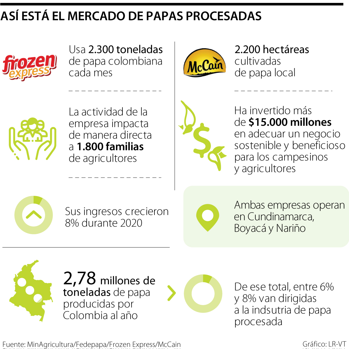 Actualmente, la venta de papas congeladas en Colombia está concentrada en las empresas Frozen Express y McCain, quienes se reparten el dominio del mercado y cuya principal estrategia de posicionamiento se enfoca en la compra de producto nacional. Mientras que la primera utiliza en promedio 2.300 toneladas de papa colombiana al mes, la segunda cuenta con más de 2.200 hectáreas cultivadas de producto local en los departamentos de Cundinamarca, Boyacá y Nariño.