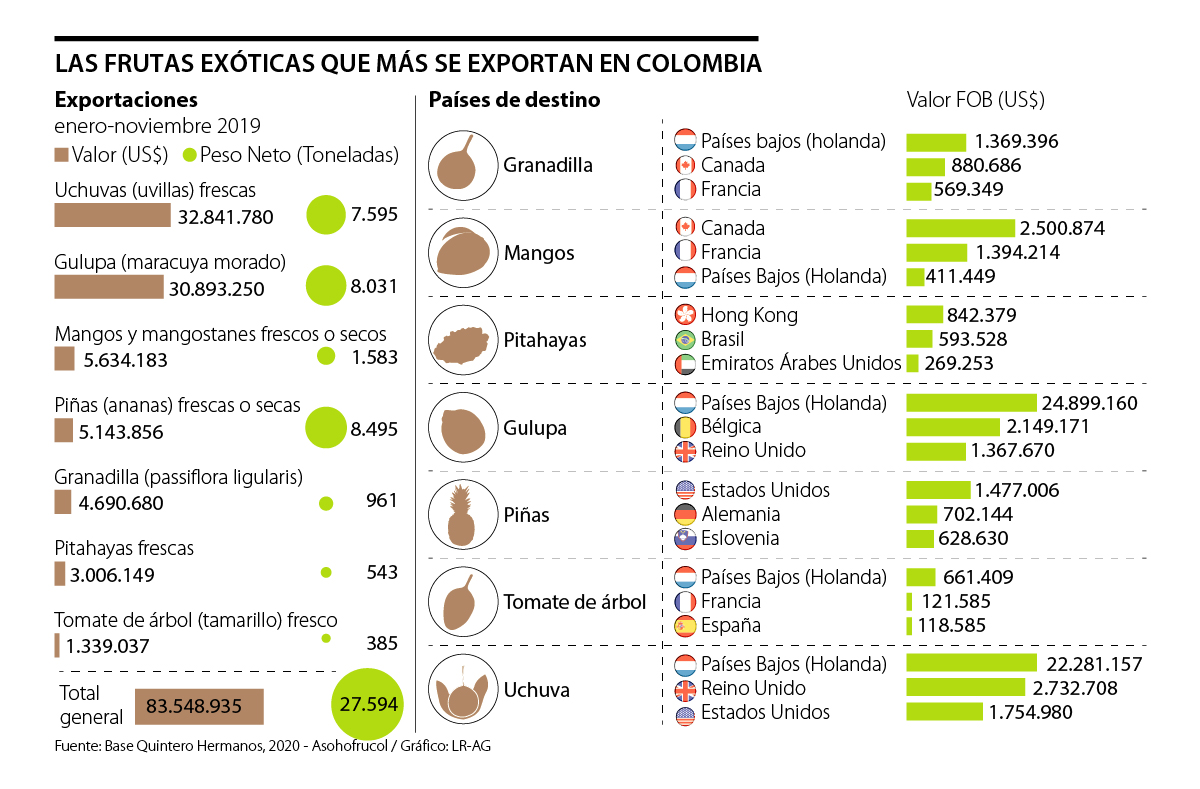 Durante 2019, las exportaciones de frutas colombianas llegaron a US$80,3 millones, 7% más que en 2018 cuando llegaron a US$75,1 millones, de acuerdo con cifras del Dane con análisis de ProColombia. Las frutas más exportadas fueron la piña, la gulupa, la uchuva, el mango, la granadilla, la pitahaya y el tomate de árbol.