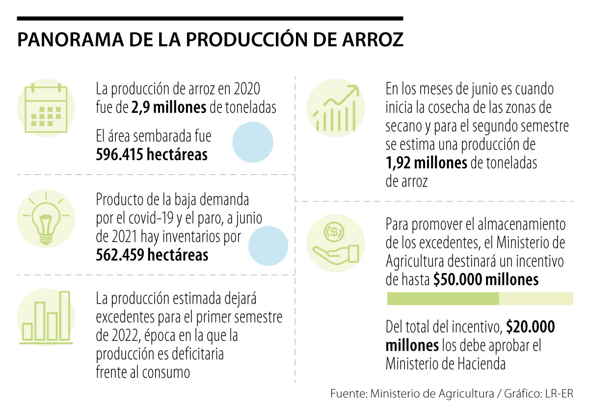 Debido a a los bajos precios del arroz producto de las más de 500.000 toneladas de sobreproducción que hay del cereal en el mercado y a la baja demanda de los consumidores, el Ministerio de Agricultura anunció un nuevo incentivo al almacenamiento de arroz con el fin de almacenar los excedentes de producción.