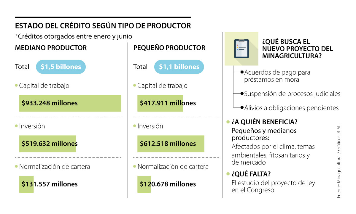El documento tiene varios ejes. El primero radica en acuerdos para la recuperación de cartera por medio de descuentos de capital, condonación de intereses a esos saldos que están en mora al corte del 30 de junio. La necesidad de esta iniciativa se basa en que el saldo de capital de esos 140.000 productores que podría beneficiar la medida, llega a casi $1 billón.