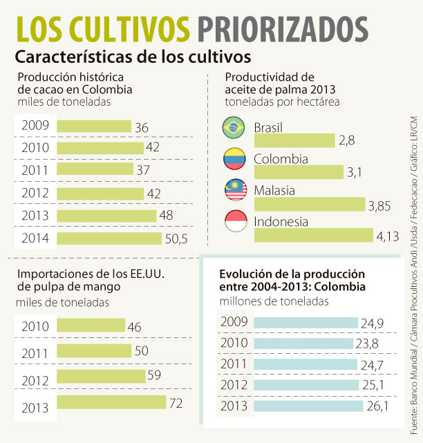 El estudio, denominado, ‘Construcción de un modelo de agricultura competitiva en Colombia’, priorizó, entre un total de ocho cultivos identificados como potenciales y promisorios en crecimiento y exportaciones, tres: palma africana, mango y cacao. Según el análisis de la Cámara, Colombia podría duplicar el valor de la producción de éstos y pasar de US$1.500 millones anuales a US$3.150 millones en los próximos 10 años, si se aplican mejoras en los procesos de producción y comercialización a mediano y largo plazo.