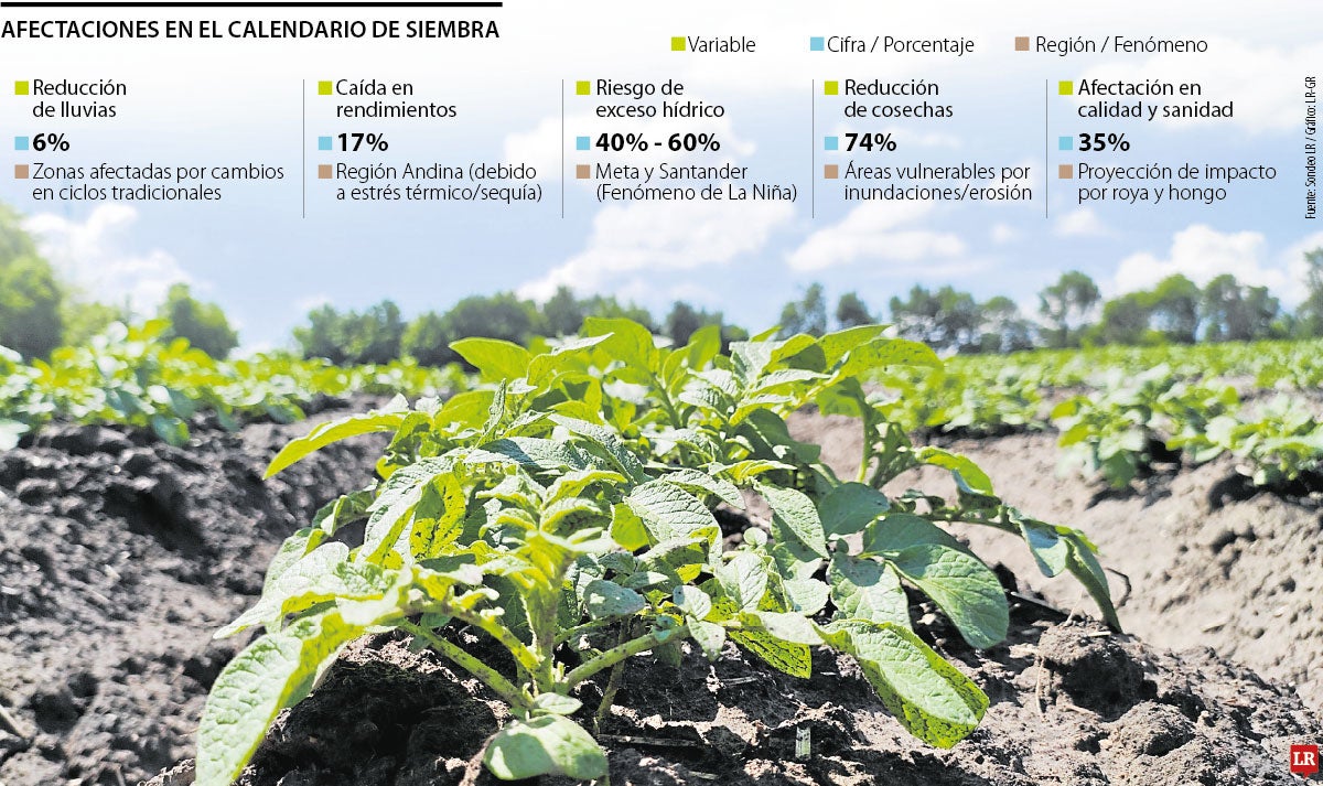 Estas variables, combinadas con la deforestación y la pérdida de cobertura vegetal, complican las decisiones fundamentales sobre siembras, insumos y rotación de cultivos, lo que exige, por parte de los productores, un monitoreo constante para no perder su inversión. En algunos cultivos, el exceso de agua intensifica pudriciones en hortalizas y produce la roya en el café, lo que provoca una disminución en la calidad del grano y por ende en número de exportaciones. En las áreas más vulnerables, las inundaciones han llegado a reducir las cosechas hasta 74%, una cifra que se traduce en pérdidas económicas de billones de pesos, lo que agrava la vulnerabilidad rural y afecta la conversión de forraje en el sector de ganadería.