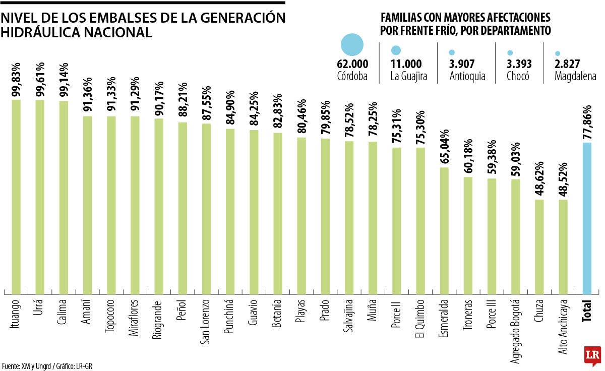 Según datos oficiales, el nivel promedio de los 24 embalses del Sistema Interconectado Nacional se ubica en 77,86 %. Sin embargo, la preocupación se concentra en aquellos que superan 90% de llenado. Entre los más críticos figuran Ituango, Urrá y Calima, que han estado por encima de 99% de su capacidad.