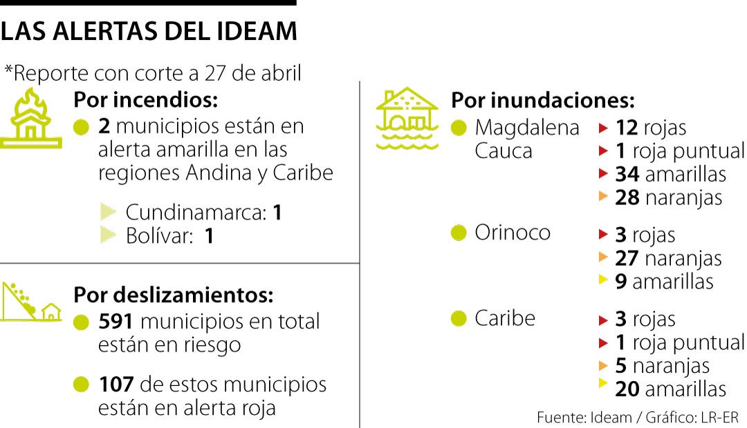 Se destaca una situación crítica por deslizamiento, alcanzando una cifra de 591 municipios, de los cuales 107 se encuentran en alerta roja, principalmente en Antioquia, Norte de Santander y Santander. En cuanto a las alertas hidrológicas, la denominada zona Magdalena Cauca presenta el mayor riesgo con 12 alertas rojas por inundaciones o crecientes súbitas. Por el contrario, la amenaza de incendios es baja, con solo dos municipios en alerta amarilla en Cundinamarca y Bolívar.