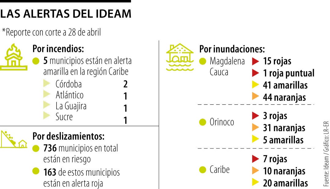 En alertas hidrológicas, se reporta mayor emergencia en la denominada zona Magdalena Cauca, con 16 alertas roja, incluyendo una puntual, seguida por la región del Pacífico con 18 alertas naranjas y el Caribe con 7 rojas. Además, se mantienen alertas amarillas meteomarinas en el oriente del Mar Caribe, el Golfo de Urabá y el Pacífico.