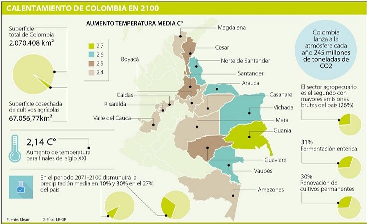 El cambio climático representa uno de los principales retos para todos los países del mundo y contrarrestarlo es uno de los más grandes desafíos que tiene que plantearse la humanidad. Si los niveles de emisiones globales de gases de efecto invernadero aumentan, la temperatura media anual de Colombia podría incrementarse gradualmente para el fin del siglo XXI en 2,14 C°. Así lo indica la tercera comunicación de cambio climático realizada por el Ideam.
