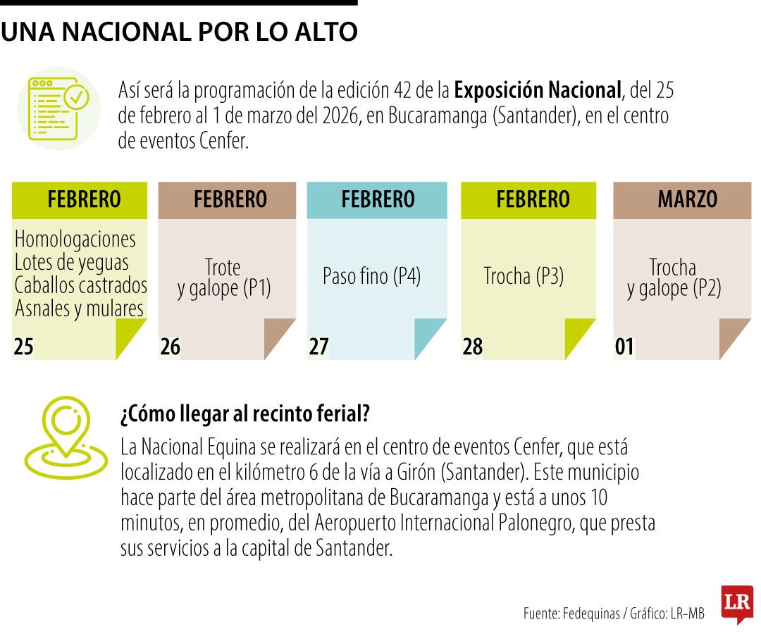 Los 650 mejores ejemplares de la caballada colombiana se espera que participen en la edición 42 de la Exposición Nacional Equina 2026, que se realizará del 25 de febrero al 1 de marzo próximos en el centro de eventos Cenfer de Bucaramanga, Santander. Los caballos y yeguas participantes en el certamen acceden a la competencia tras superar una clasificación previa y obtenido el puntaje necesario, de acuerdo a la resolución de la federación, que reglamenta la participación de este torneo.