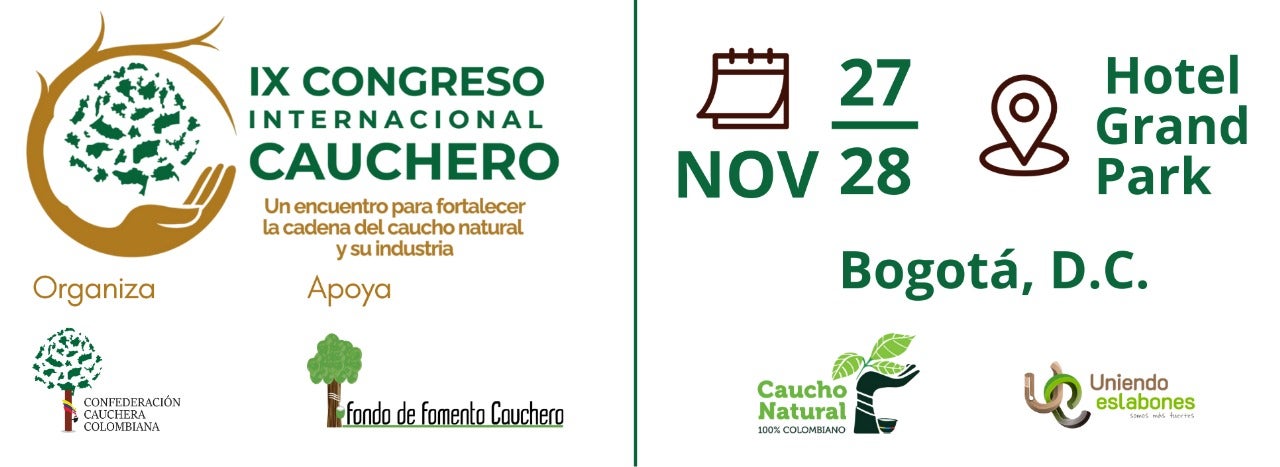 El próximo jueves 27 y viernes 28 de noviembre se tendrá el IX Congreso Internacional Cauchero en el Hotel Gran Park de Bogotá. El evento es organizado por la Confederación Cauchera Colombiana (CCC) y será un espacio de reunión para productores, investigadores, industriales y expertos, en el que hablarán de productividad, eficiencia, sostenibilidad y economía circular en la cadena productiva del caucho.