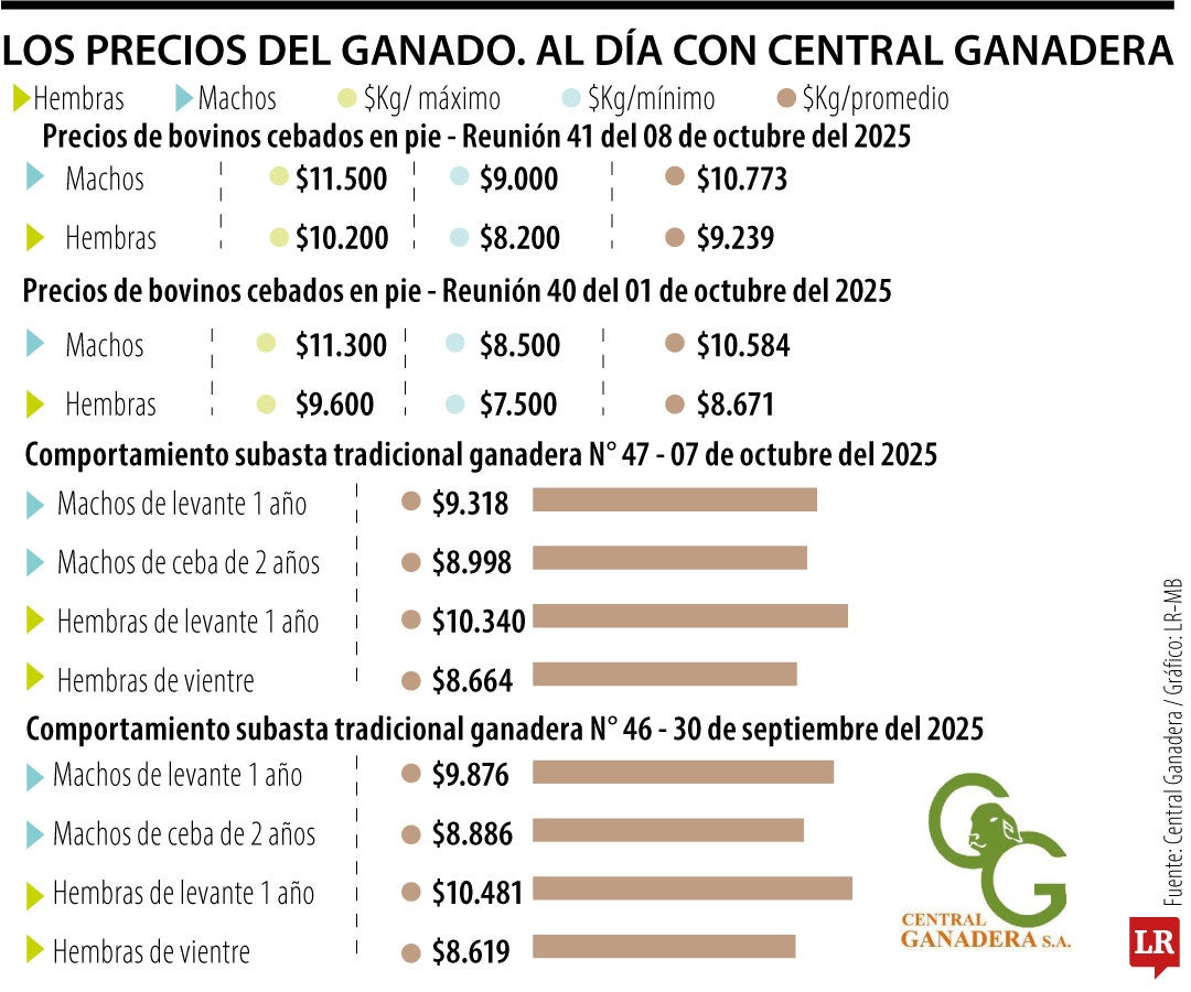 Esta semana también se tuvo la Subasta Tradicional Ganadera número 47, que se realizó el martes 7 de octubre. En la categoría de machos de levante de un año, el precio promedio por kg fue de $9.318, mientras que el de macho de ceba de dos años fue de $8.998. Por su parte, el precio promedio del kilo de hembras de levante de un año fue de $10.340, y el de hembras de vientre de $8.664.