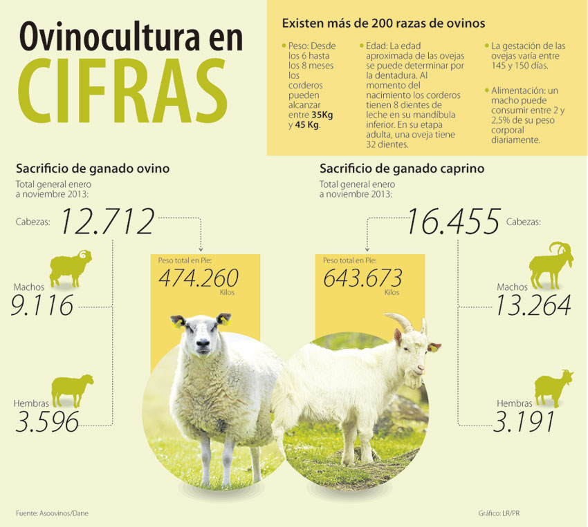 Según cifras del Dane, de enero a noviembre de 2013, el total general de cabezas de ganado ovino sacrificado fueron 12.712, mientras que el total general en 2012 fue de 11.702. Por su parte, el sacrificio de ganado caprino también fue mejor en 2012 que el año pasado. En total fueron 16.830 y 16.455 cabezas, respectivamente.