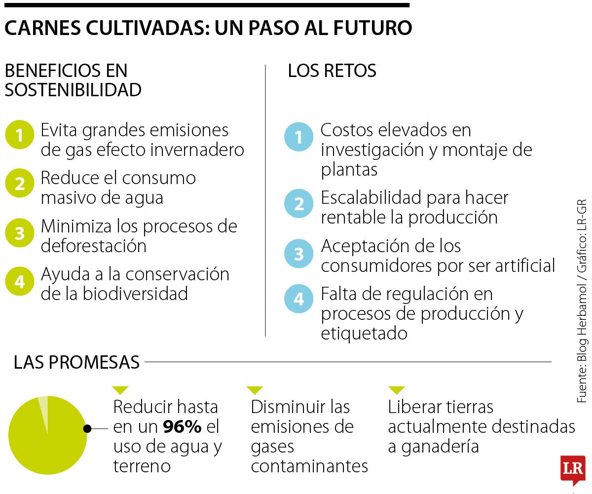 Los productores de carne cultivada prometen reducir en hasta un 96% el uso de agua y terrenos, disminuir la emisión de gases y la liberación de grandes extensiones de tierra hoy utilizadas para la ganadería tradicional. Pero la masificación en la producción de carne cultivada a nivel mundial está lejos. Los costos elevados en investigación y montaje, la producción en escala rentable, la aceptación del consumidor y la regulación y los etiquetados son barreras con las cuales todavía tendrá que luchar.