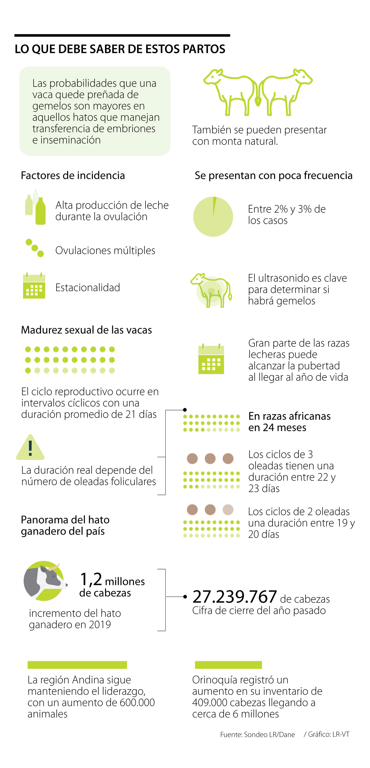 Si bien los partos gemelares en vacas se presentan con muy poca frecuencia, casi que entre 2% y 3 % de los casos, hay varios factores que pueden influir en la incidencia de la generación de este tipo de hechos tales como las ovulaciones múltiples. También, la alta producción de leche durante la ovulación y la estacionalidad. Así lo destacó el médico veterinario zootecnista, Wilson Hernando Mora.