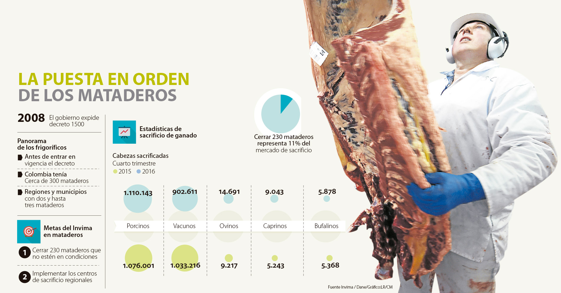 Desde agosto de 2016, el Instituto Nacional de Vigilancia de Medicamentos y Alimentos (Invima) empezó el registro y cumplimiento de las nuevas medidas sanitarias en los mataderos que en el decreto 1500 se contemplaba desde 2007.