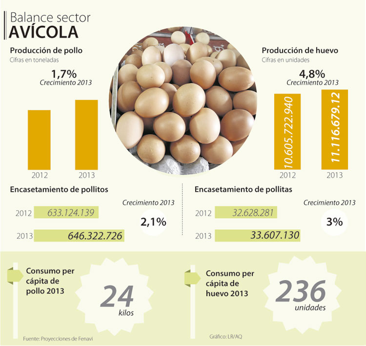 Según las cifras entregadas por la Federación Nacional de Avicultores de Colombia (Fenavi), el año pasado el renglón registró un crecimiento de 3,3% en el tema de la genética, 14,7% en la producción de carne de pollo, y 4,9% en la de huevo.