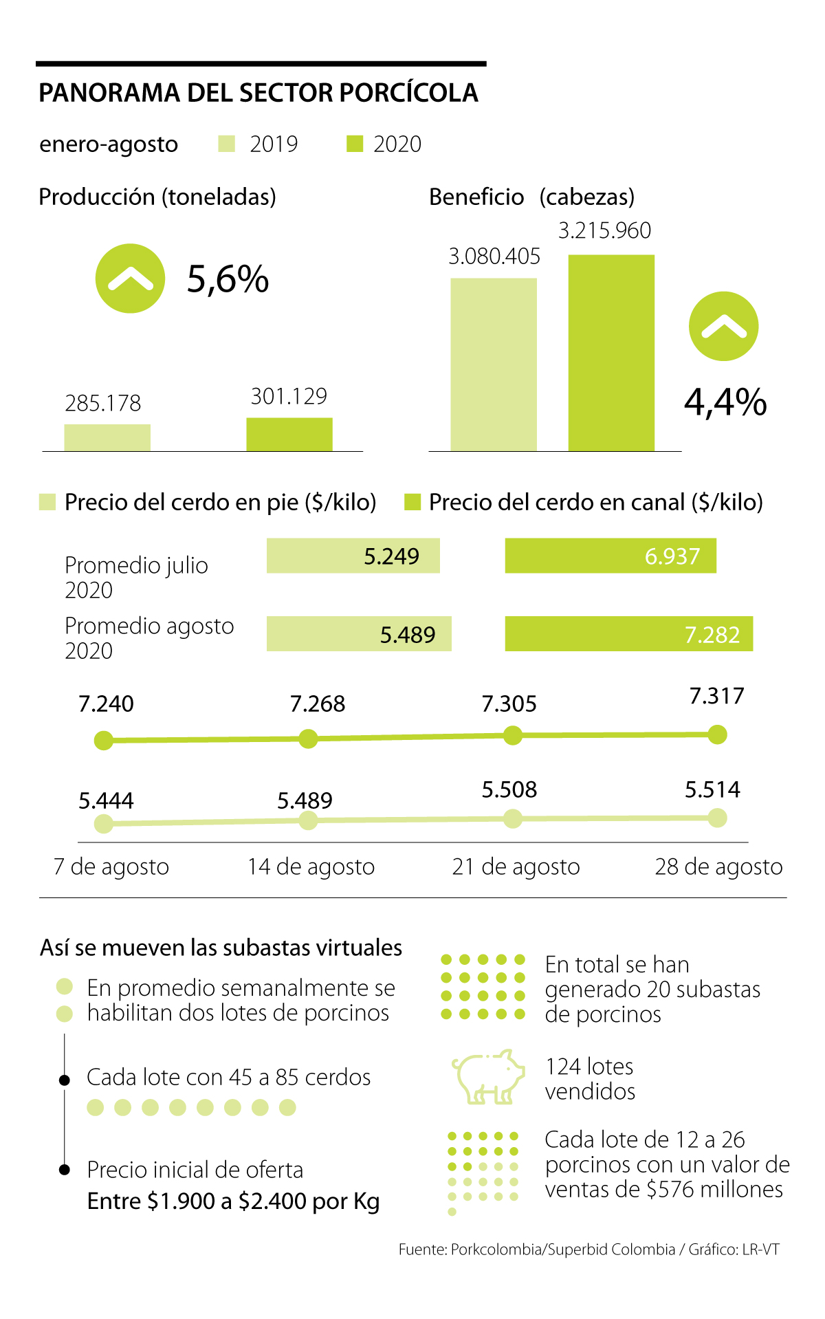 De acuerdo con información de la Asociación Colombiana de Porcicultores (Porkcolombia), con corte a agosto de 2020, se han producido aproximadamente 301.129 toneladas de carne de cerdo, lo cual representa un aumento del 5,6% con respecto al mismo período del año anterior. De igual forma, en ese mismo periodo se han generado 3,2 millones de cabezas en beneficio lo que significa un aumento del 4,4% frente a 2019.