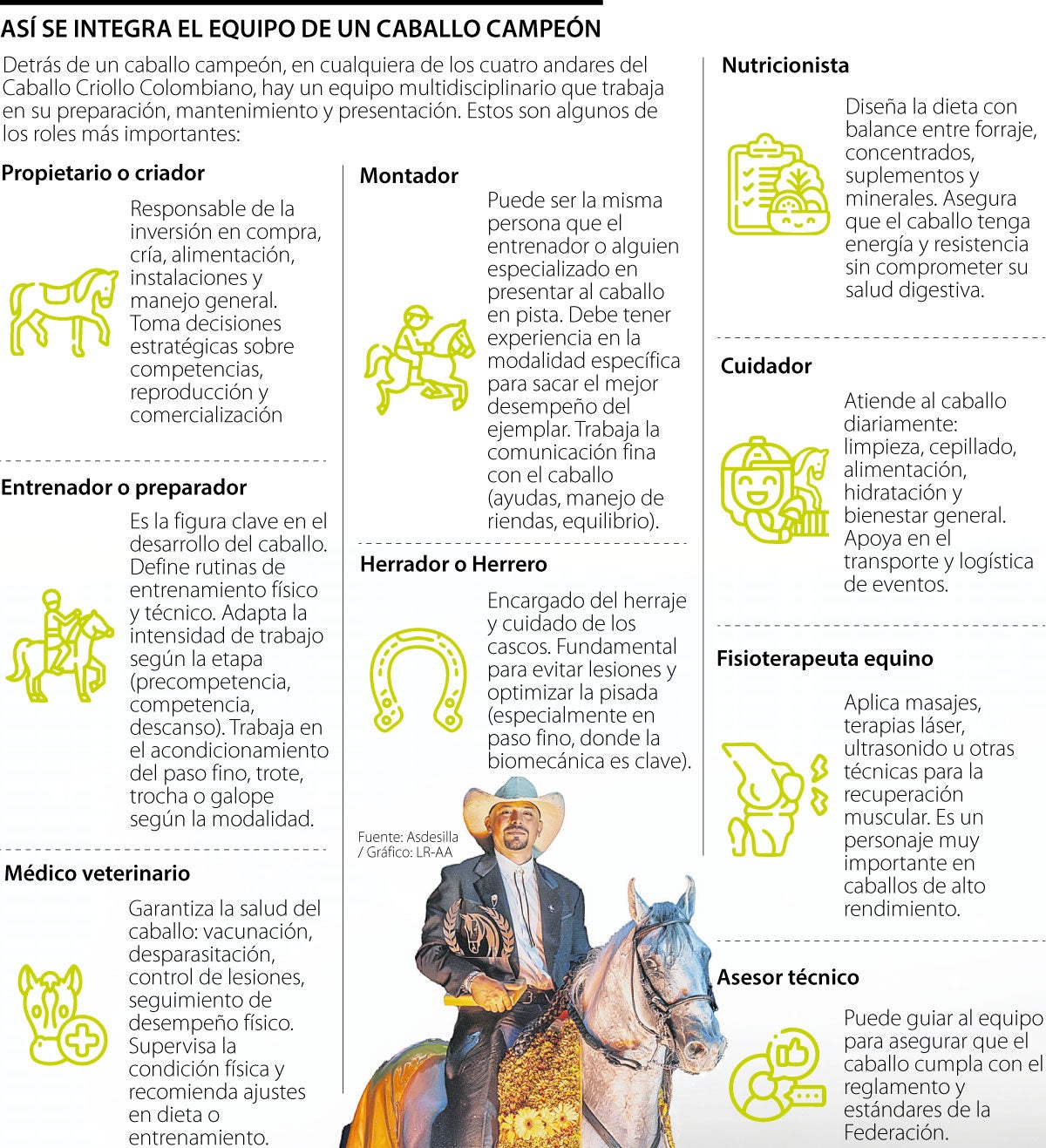La grandeza del Caballo Criollo Colombiano, reconocido mundialmente por su suavidad, hermosura y docilidad, en sus cuatro andares (Trote y galope, Trocha y galope, Trocha y Paso Fino) no se construye únicamente sobre la genética ni la belleza del ejemplar. Detrás de cada ejemplar que sale a pista y triunfa existe un trabajo silencioso, meticuloso y altamente profesional que comienza desde antes de nacer y se refleja en la competencia. Lograr que un caballo se convierta en campeón es el resultado de la articulación de un equipo multidisciplinario que combina conocimiento, técnica, ciencia y pasión.