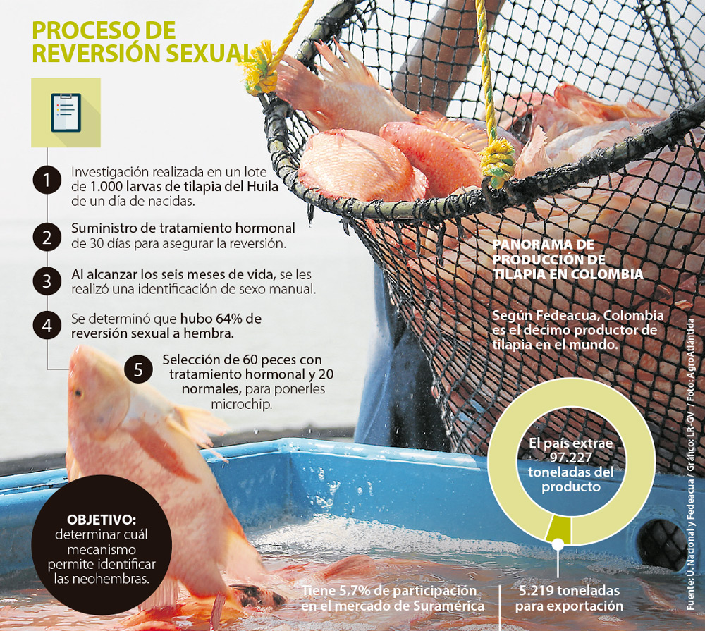 En su trabajo, Acosta hizo un tratamiento hormonal por 30 días a 1.000 larvas de tilapia del Huila de un día de nacidas. Tras seis meses, realizó un sexaje para escoger las hembras y descartar los machos.