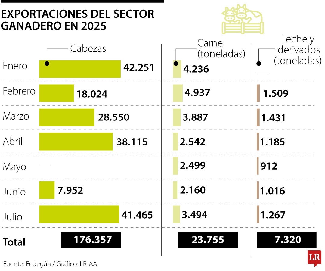 Fedegán publicó las cifras de exportación de la industria ganadera durante los primeros siete meses del año, es decir, entre enero y julio de 2025. De acuerdo con el informe, se enviaron al exterior 176.357 cabezas de ganado, 23.755 toneladas de carne bovina y despojos, y 7.320 toneladas de leche y sus derivados (sin datos de enero).