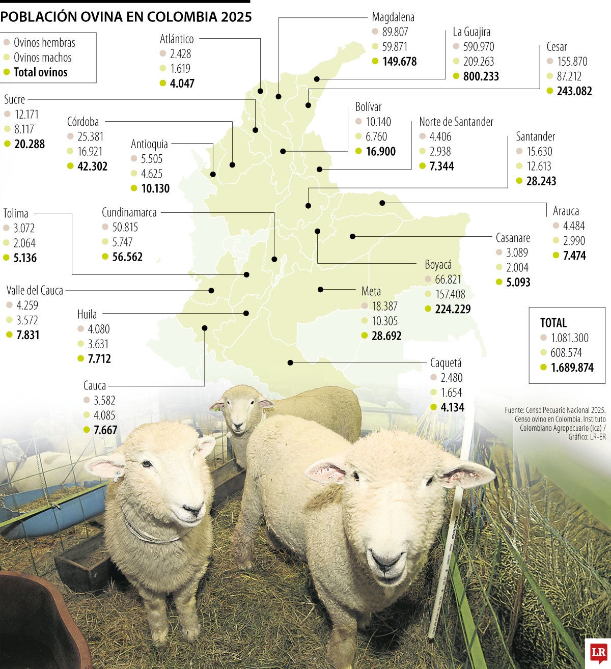 Según el censo de ovinos que reporta el Instituto Colombiano Agropecuario (ICA) a 2025, en Colombia hay una población de 1.689.875 ejemplares, de los cuales 608.574 corresponden a machos, y 1.081.300 son hembras.