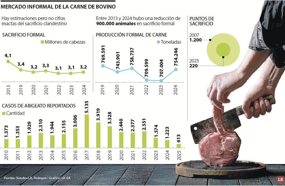 El mercado informal de la carne es una problemática que, aunque no tiene cifras exactas, ha ido afectando a varios actores de la cadena productiva. Basta solamente con ver las cifras de sacrificio formal durante los últimos años para darse cuenta de que ha habido “una reducción de 900.000 animales en 11 años, que no tiene que ver con que la gente haya dejado de comer carne, sino que significa que las fuentes de origen de la carne en donde la están adquiriendo los colombianos son informales o clandestinas”, afirmó Óscar Cubillos, director de planeación y estudios económicos de Fedegan.