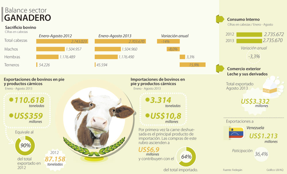 De acuerdo con cifras de Fedegán, entre enero y agosto del presente año se han exportado un total de 110,618 toneladas de bovinos en pie y productos cárnicos, lo que representa una suma de US$359 millones.